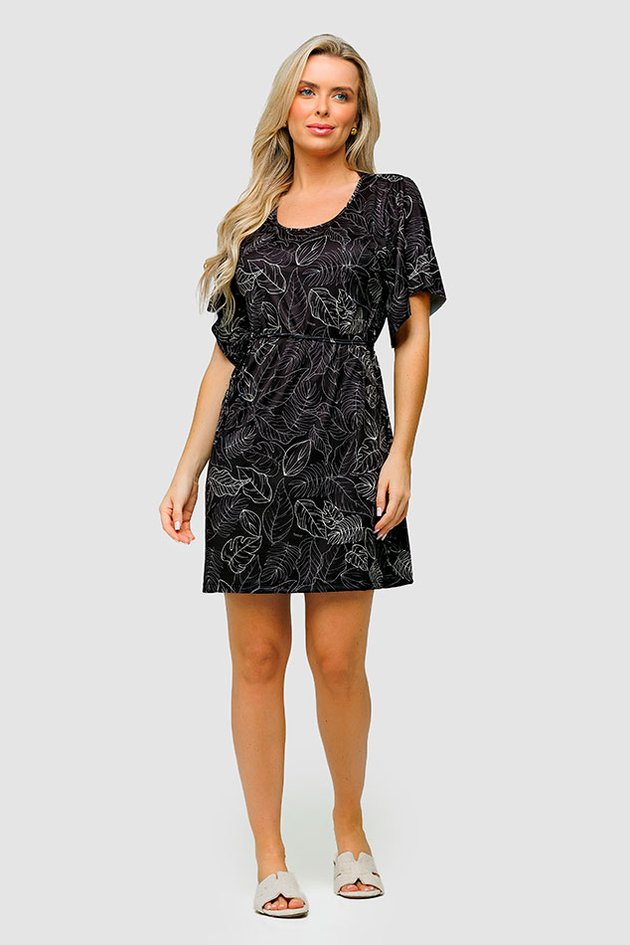 Nosso Vestido Kaftan com estampa de folhagem na cor preta é super versátil. Ideal para diversas ocasiões, desde um passeio casual até um evento mais descontraído.