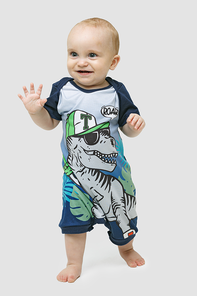 Macacão bebê dinossauro em algodão estampado de dinossauro.