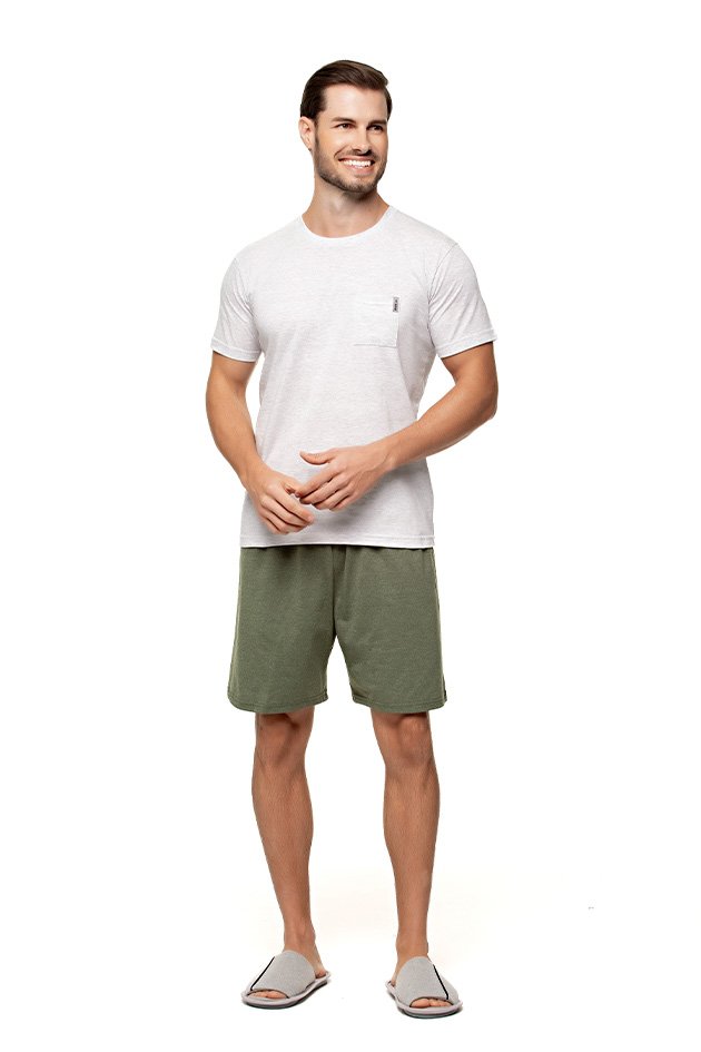 Blusa manga curta no tom mescla claro, com gola redonda e detalhe de bolso no peito; combinando com a bermuda em verde mescla, que possui elástico no cós e um ótimo caimento no corpo.