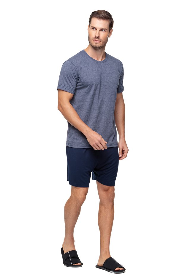 Pijama curto masculino comporto por blusa com modelagem reta, gola redonda, na cor mescla marinho com detalhe na manga e bermuda lisa marinho.