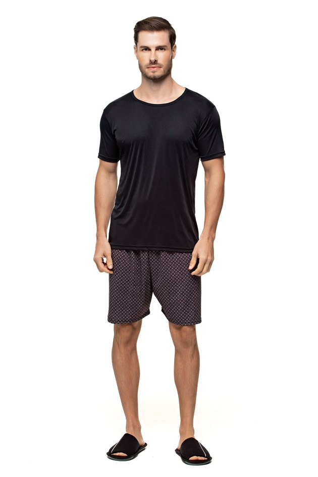 Pijama curto masculino comporto por blusa com modelagem reta, gola redonda, na cor preta e bermuda com estampa gravataria.