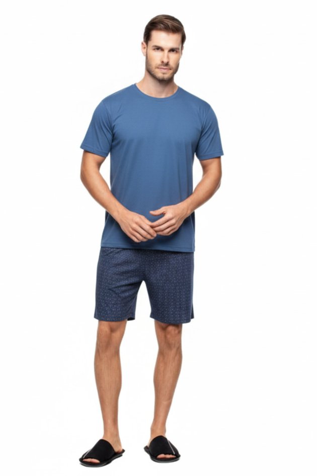Pijama curto masculino comporto por blusa com modelagem reta, gola redonda, disponível em duas cores.
